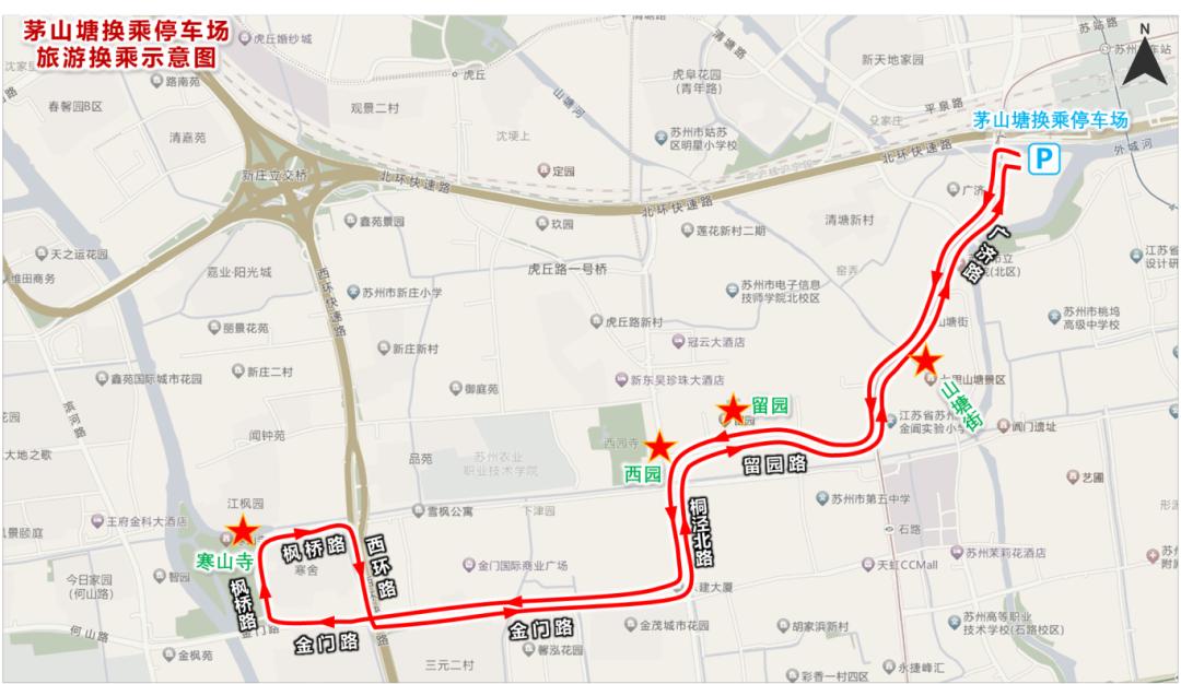循环线路(运行时间8:00-17:00):茅山塘换乘停车场-广济路(山塘街)-留园路(留园)-桐泾北路(西园)-金门路-枫桥路(寒山寺)-西环路-金门路-桐泾北路-留园路-广济路-茅山塘换乘停车场。