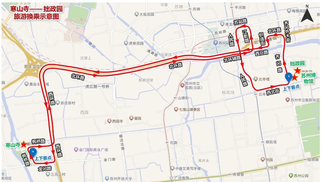 注:寒山寺上下客点:寒山寺停车场;拙政园上下客点:齐门路东侧苏州博物馆北侧。