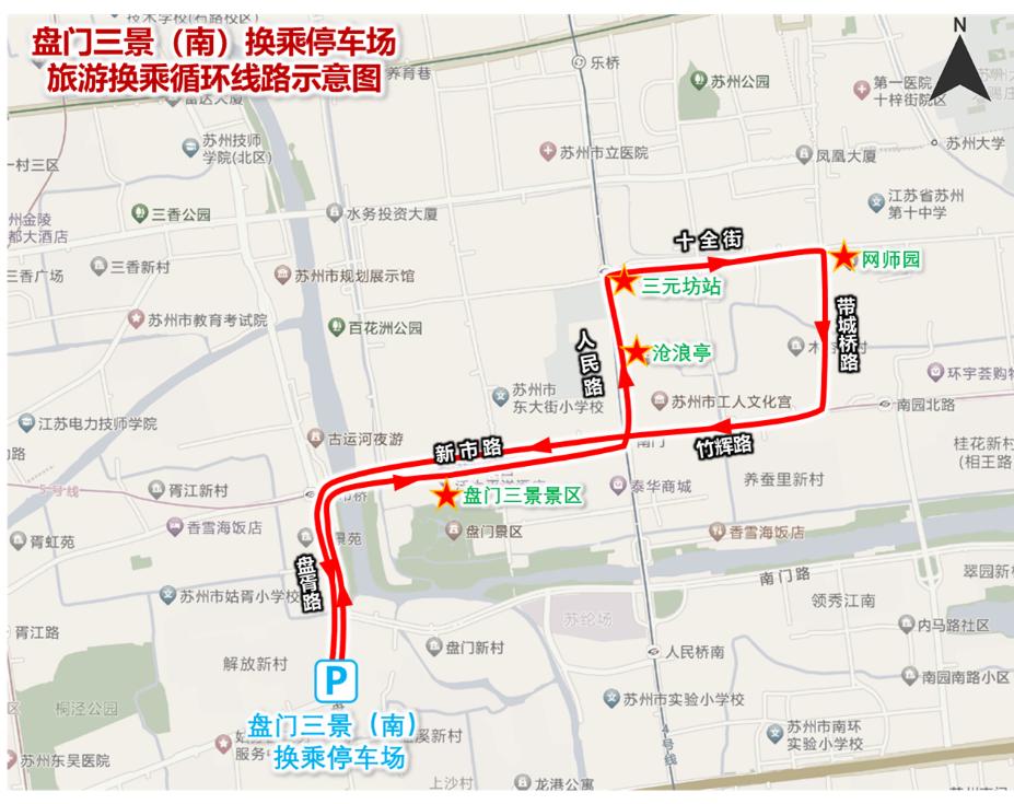 循环线路(运行时间8:00-17:00):盘门三景(南)换乘停车场—盘胥路—新市路(盘门三景景区)—人民路(沧浪亭)—十全街(网红街)—带城桥路(网师园)—竹辉路—新市路—盘胥路—盘门三景(南)换乘停车场。