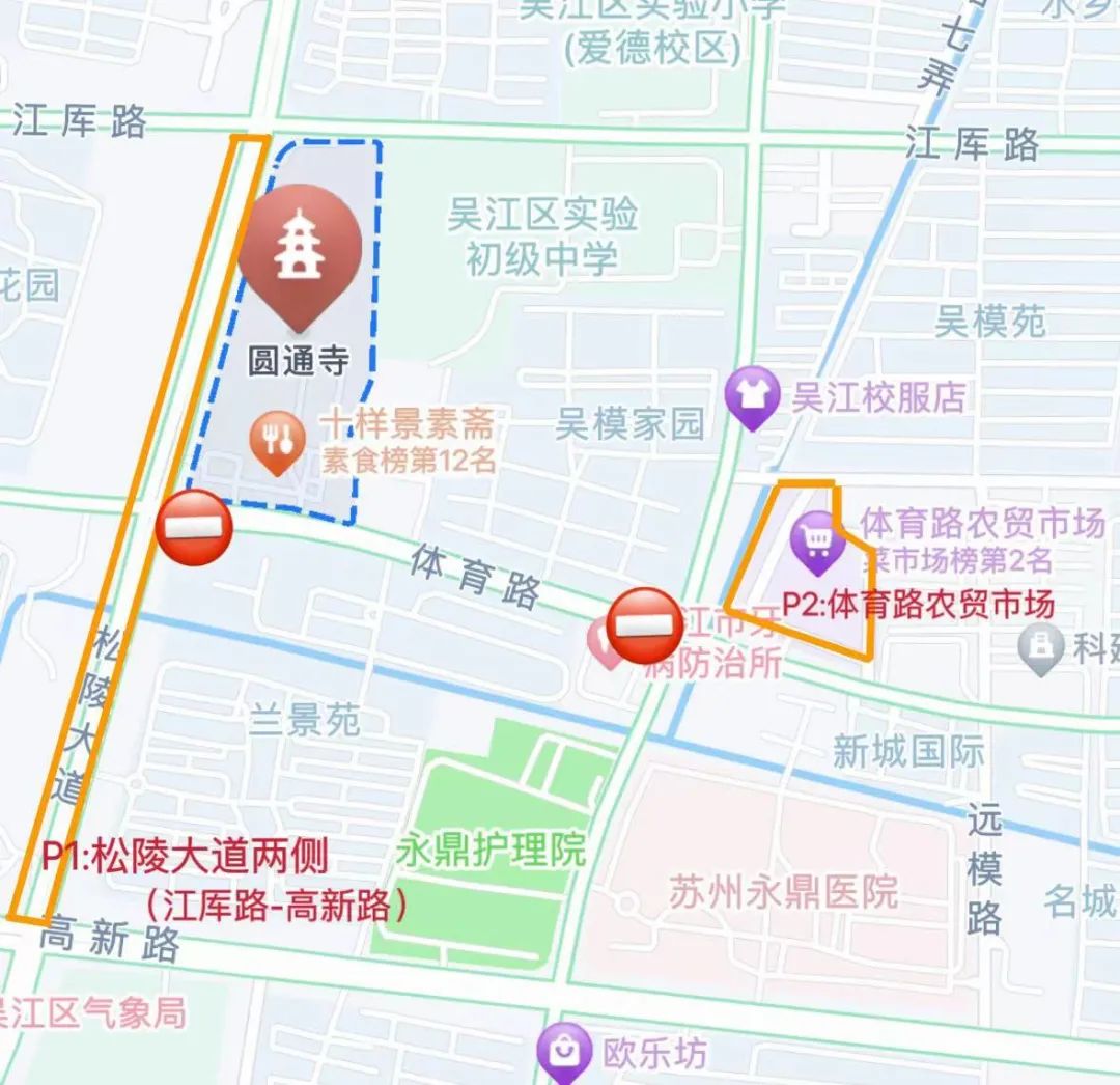 为保障除夕圆通寺敬香活动顺利开展,活动期间,圆通寺周边道路将进行交通管制。2月9日(除夕)当天21:30至活动结束,吴模路体育路路口禁止社会车辆由东向西行驶,松陵大道体育路路口禁止社会车辆由西向东行驶。
