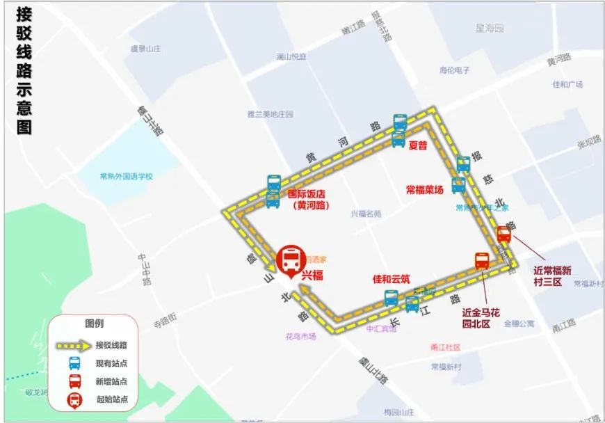 B线(逆时针方向):虞山北路(兴福公交站)--长江路(佳和云筑公交站)--报慈北路(常福新村三区临时接驳点)--报慈北路(常福菜场公交站)--黄河路(夏普公交站)--黄河路(国际饭店公交站)--虞山北路(兴福公交站)
