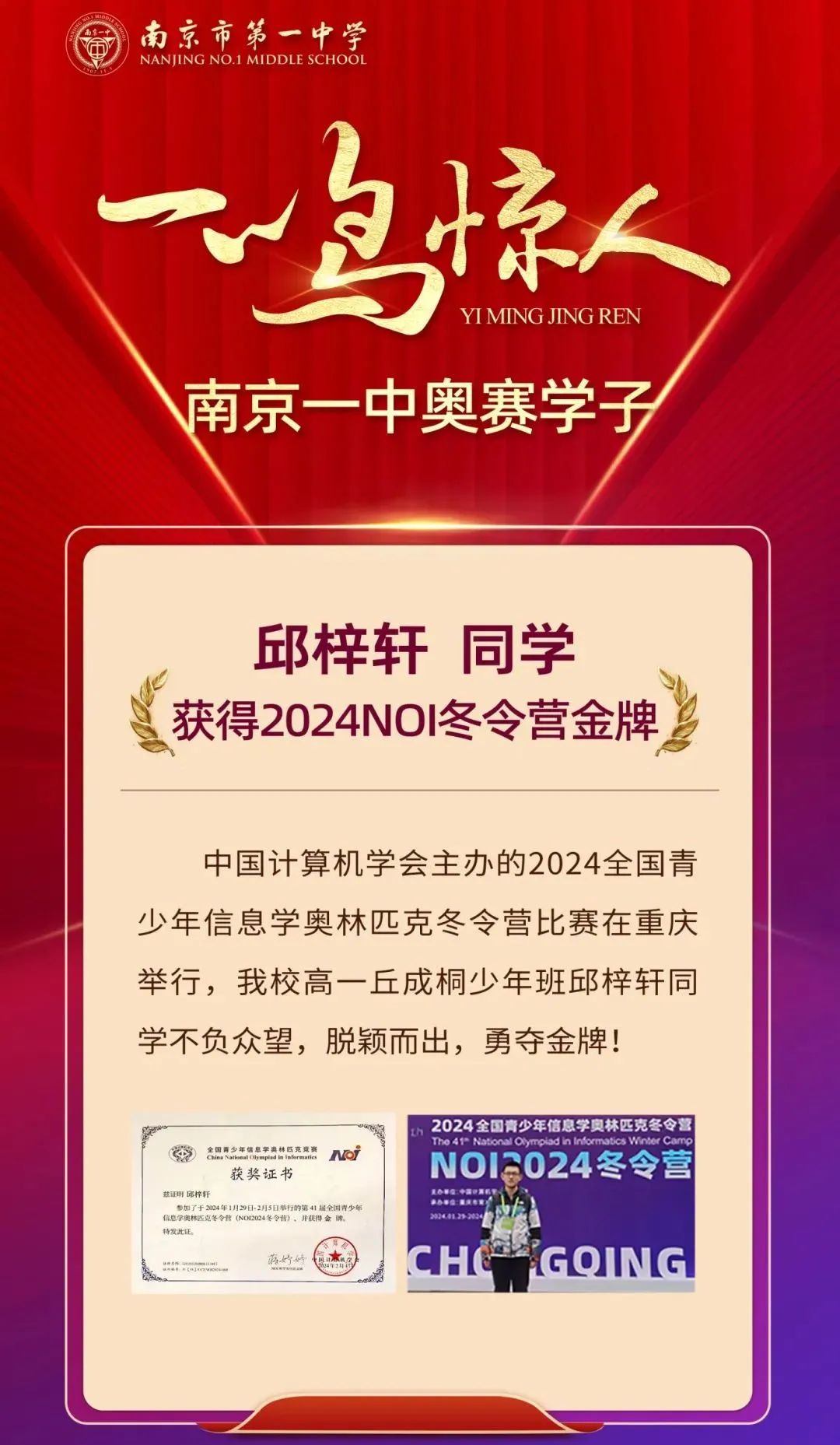 在本次比赛中,南京一中邱梓轩同学凭借优异的成绩夺得金牌!