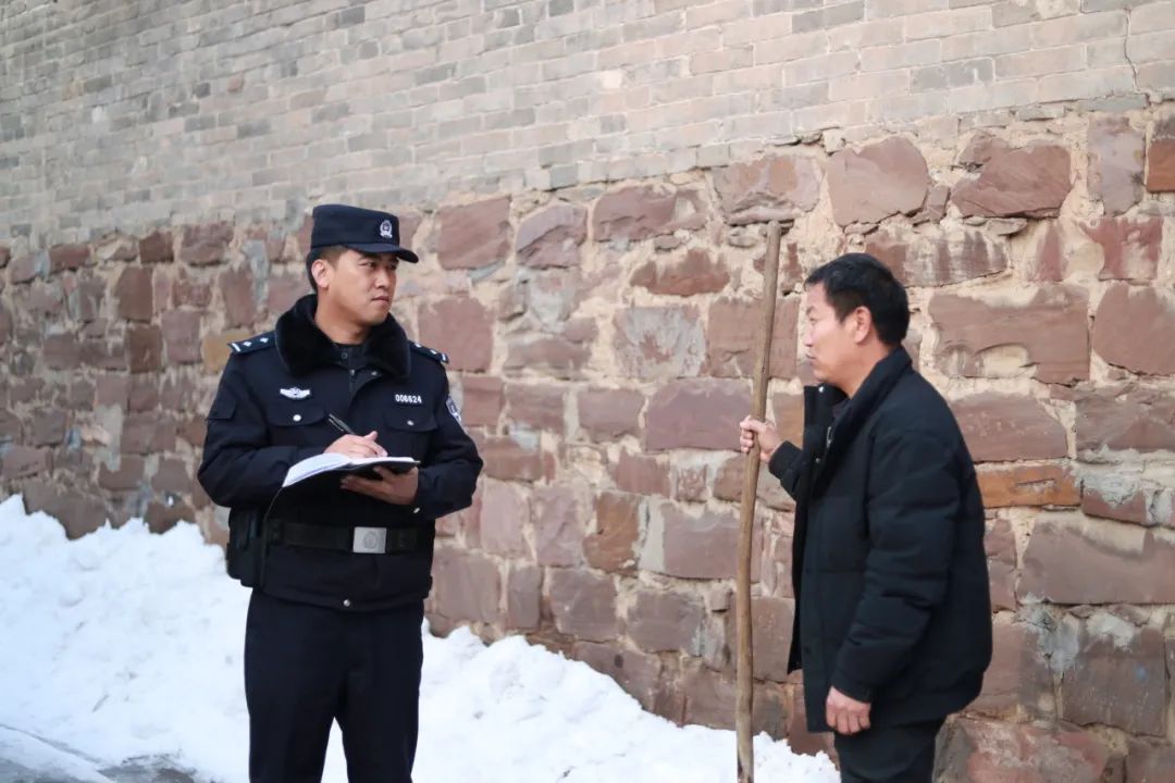 驱车沿着蜿蜒的山路行驶5公里,就到了西高渠村。“今天这么冷,你们还跑过来关心我一个老人家,真是谢谢你们。”薛奶奶看着白浩踏雪而来,便要把自己的热水袋递给他暖暖。白浩笑着婉拒了:“婆,今年天气冷,你自己要做好保暖,热水袋插头充好要记得拔掉,有什么事你就打我电话,手机不好翻,你就照着警民连心卡上的号码打。”白浩一边检查房内安全隐患,一边交代老人。在同村的另一户独居老人家中,白浩也耐心地叮嘱老人地面结冰,走路要小心一点,不要摔倒……老人们似乎对于白浩的“唠叨”早已习以为常。