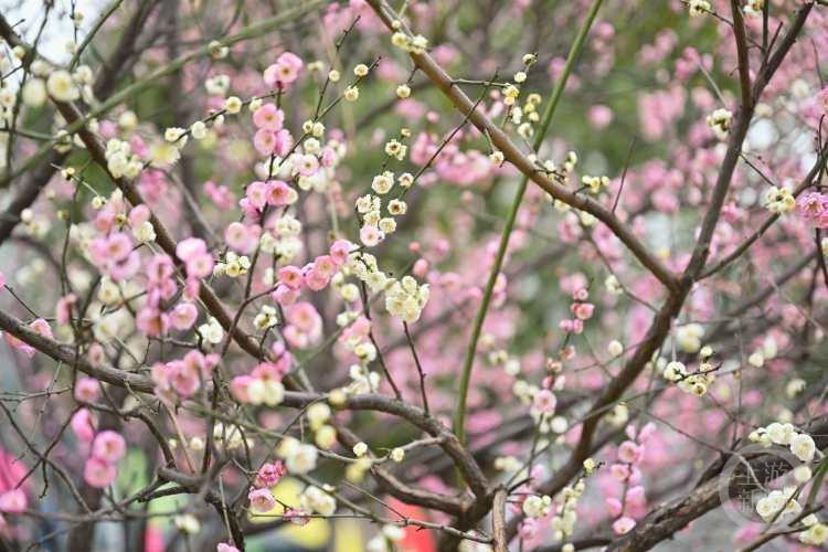 这个春节,清雅的绿梅和娇艳的红梅竞相开放,让山城街头喜上“梅”梢。