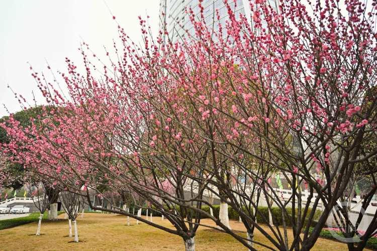 与此同时,江北区华唐立交、江北区政府广场等地的红梅也花开正艳,带来春的气息。