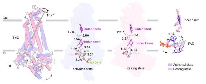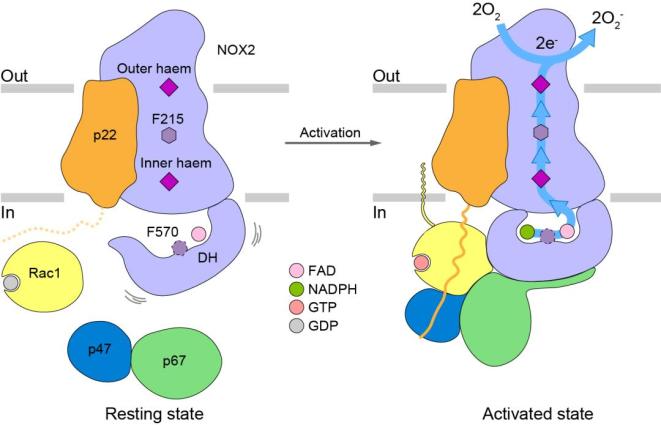 通过比较静息和激活两种状态下的NOX2的构象,作者们发现在胞浆组分组装后,p67-Rac1的结合会导致DH结构域的收缩并对接到TMD上,从而稳定NADPH的结合并将其电子经由FAD、近胞内侧血红素、F215和近胞外侧血红素传递到胞外的氧气,最终产生超氧阴离子。