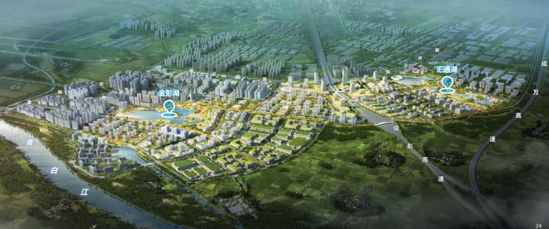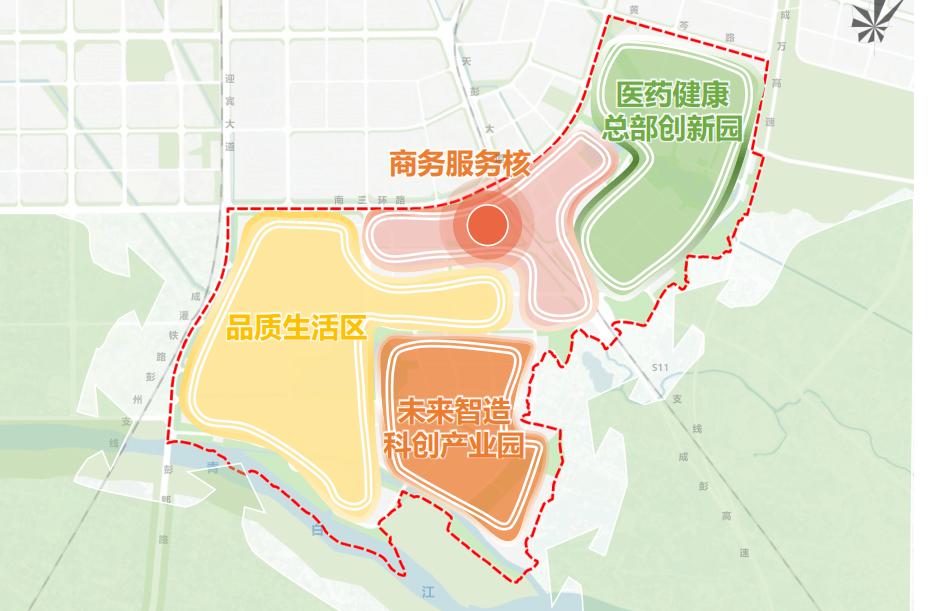 按照《规划》,空间布局上,根据金牛区、彭州市资源特点及空间承载能力、未来发展潜力,双方聚焦“门户枢纽、科创兴产、绿色发展”三大合作基础,共同决定在金彭湖-汇通湖双湖片区规划形成“一核两园一区”(一核即商务服务核,两园即医药健康总部创新园、未来智造科创产业园,一区即品质生活区)空间格局。