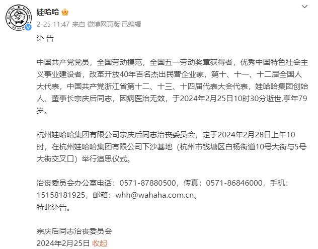 回顾宗庆后传奇精彩的一生,在他的带领下娃哈哈集团注重产品质量和品牌建设,坚持主业,坚持实业,娃哈哈集团官网披露数据显示,娃哈哈集团35年累计销售额8601亿元,利税1740亿元,上缴税金742亿元。同时,娃哈哈集团积极履行社会责任,关注社会公益,为脱贫攻坚和乡村振兴事业做出积极贡献。