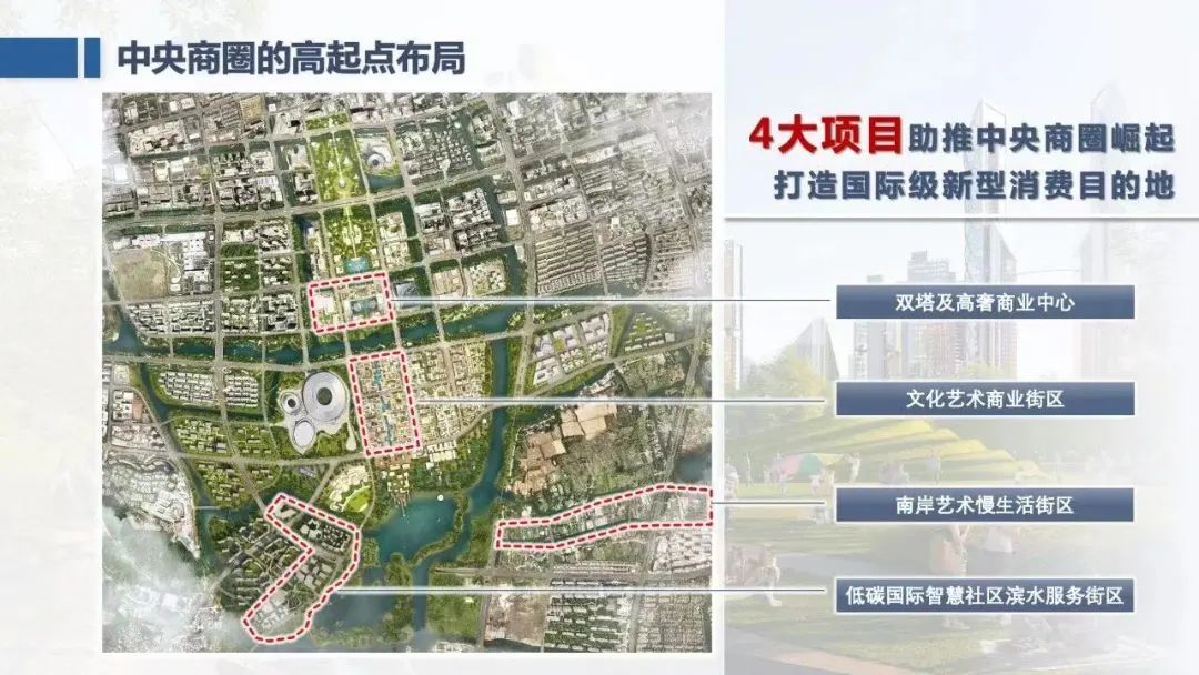 作为城市重要新中心的核心区块,新中心中央商圈将紧密结合中轴线一体设计、统筹建设,布局4大项目助推中央商圈崛起,全力打造国际级新型消费目的地,分别是对标香港太古广场的双塔及高奢商业中心、对标纽约第五大道的文化艺术商业街区、对标新加坡克拉码头滨水街区的低碳国际智慧社区滨水服务街区、对标上海蟠龙天地的南岸艺术生活街区。