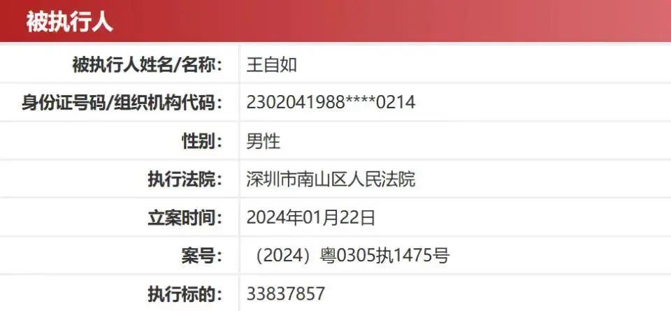 近期,中国执行信息公开网显示,王自如新增一则被执行人信息,执行标的3383万余元,执行法院为深圳市南山区人民法院。