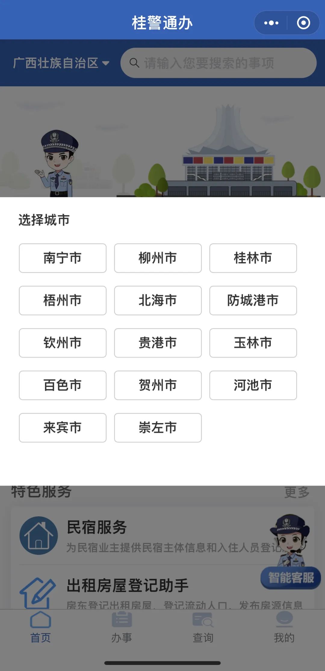 打开支付宝或微信搜索“桂警通办”,点击“桂警通办”对应名称的小程序。