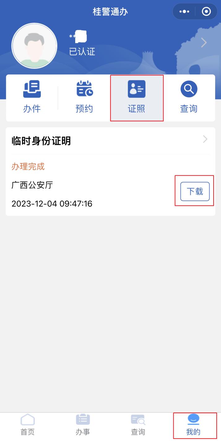 人脸识别完成后,当收到审核通过短信通知后。进入“桂警通办”小程序【我的】页面,点击【下载】。