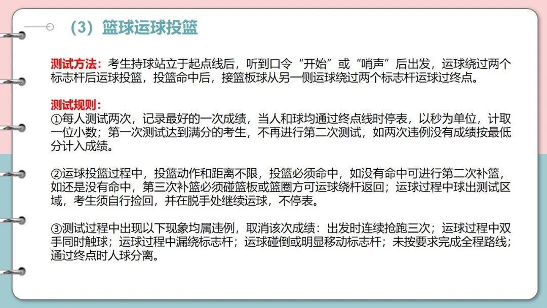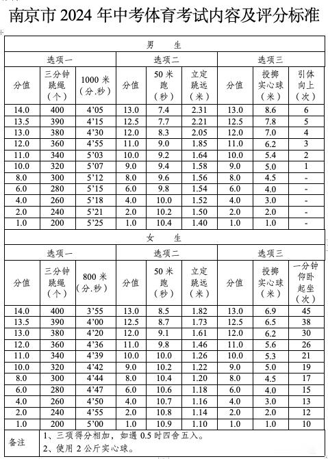 宿迁市2024年中考体育考试由必考项目和选考项目组成。必考项目为50米跑、立定跳远和耐久跑(男生1000米、女生800米)。选考项目男生为掷实心球或引体向上,女生为掷实心球或一分钟仰卧起坐,考生可在两项选考项目中任选一项。总分值为40分,每项满分为10分。