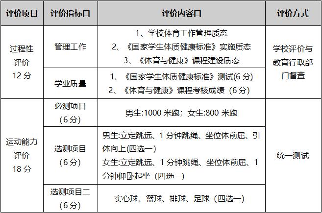 总分由平时成绩和现场测试两部分组成。平时成绩6分,初一、初二各3分,其中《国家学生体质健康标准》评定2分、运动爱好评价1分;现场测试34分。考试成绩计入初中学业水平考试总分。