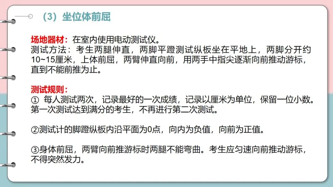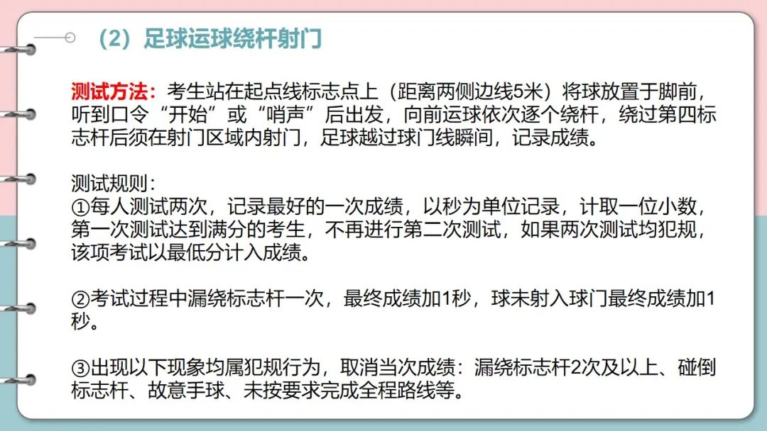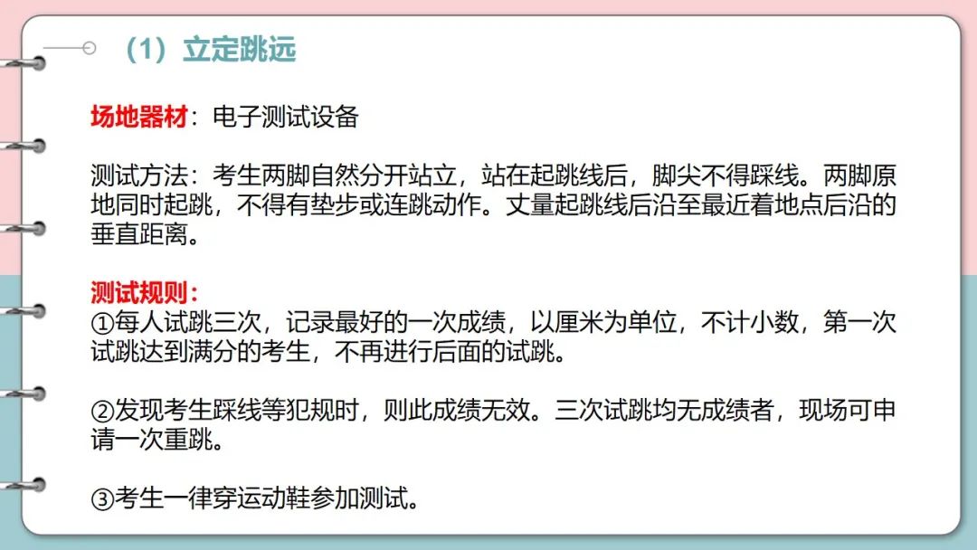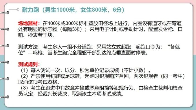 现场测试环节中,每一位考生每人须测试3项,并在一个单元内完成考试。除了第一类800米/1000米外,第二、三、四类均为选考项目。