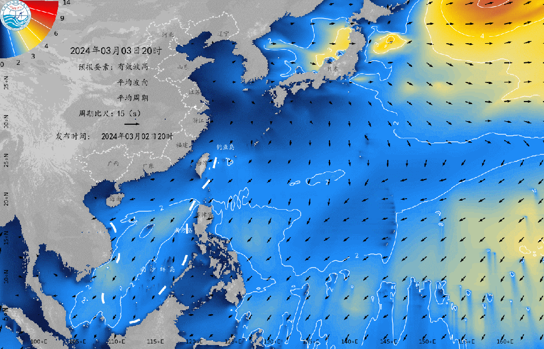 东海的大浪区维持并扩展至黄海南部,浪高2到3.5米。