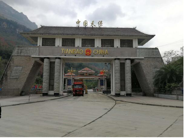 天保又称船头,19世纪80年代法侵占越南时期,法军乘船沿盘龙河而上进行勘探,到此处河段因河水湍急,船只受阻,不能前行,因而此地命名为“船头”,喻意船停止的地方。天保口岸国门设计造型为船型,彰显一种祖国腾飞向上的豪情。国门两侧雕刻体现文山地方民族风格的壮族和苗族两种民族文化的铜鼓和芦笙图案。八棵腾龙柱威武雄壮,象征中国国门的威严。