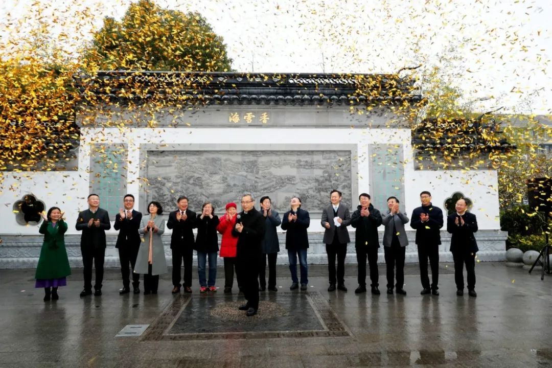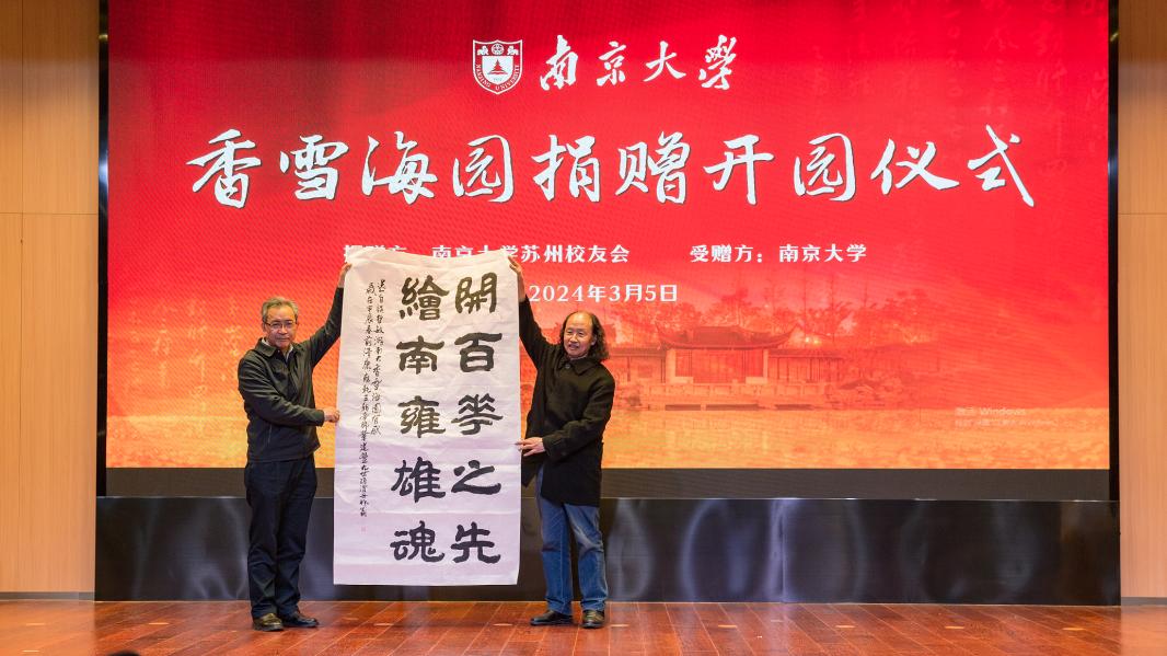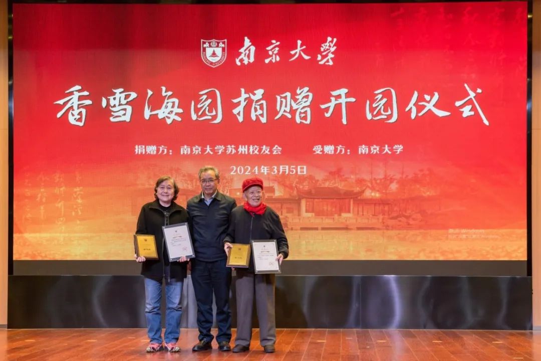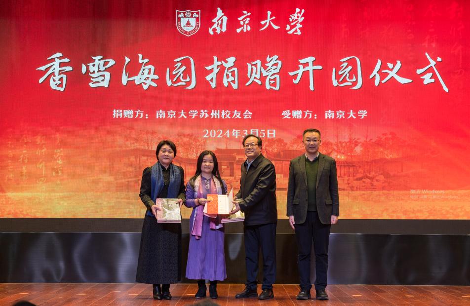 与会嘉宾共同为香雪海园揭牌。谈哲敏代表学校向薛为民、谢慧新颁发感谢铭牌,向南京大学苏州校友会和苏州思成古建有限公司颁发感谢状。