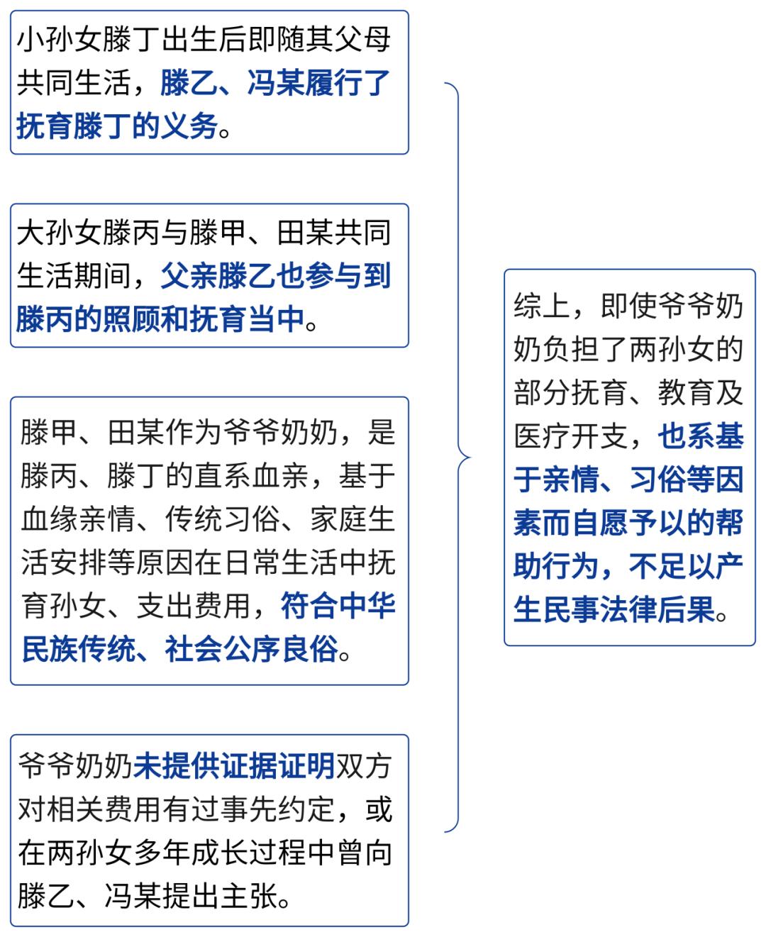 腾乙是滕丙、滕丁的爸爸,滕甲、田某是滕丙、滕丁的爷爷奶奶。2008年,滕乙与前妻协议离婚,女儿滕丙由爸爸滕乙抚养。2014年,滕乙与冯某再婚,2018年生育滕丁。2014年至2022年期间,大孙女滕丙随爷爷奶奶共同生活。小孙女滕丁出生后一直随爸爸妈妈共同生活。2022年,爷爷奶奶起诉要求滕乙、冯某支付大孙女滕丙2014年至2022年的住宿、生活费88万余元,支付小孙女滕丁2018年至2021年的生活开销8万余元。
