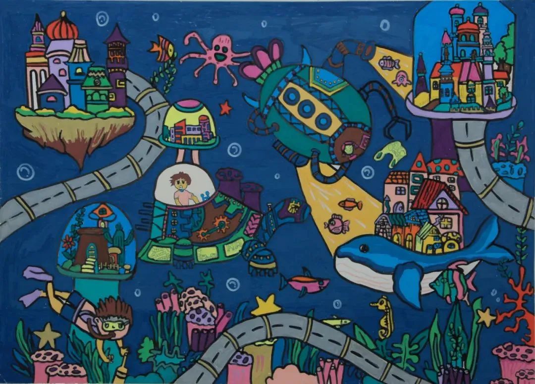 科学幻想绘画作品内容为少年儿童对未来科学发展的畅想和展望,利用绘画形式表现未来人类的生产、生活情景。