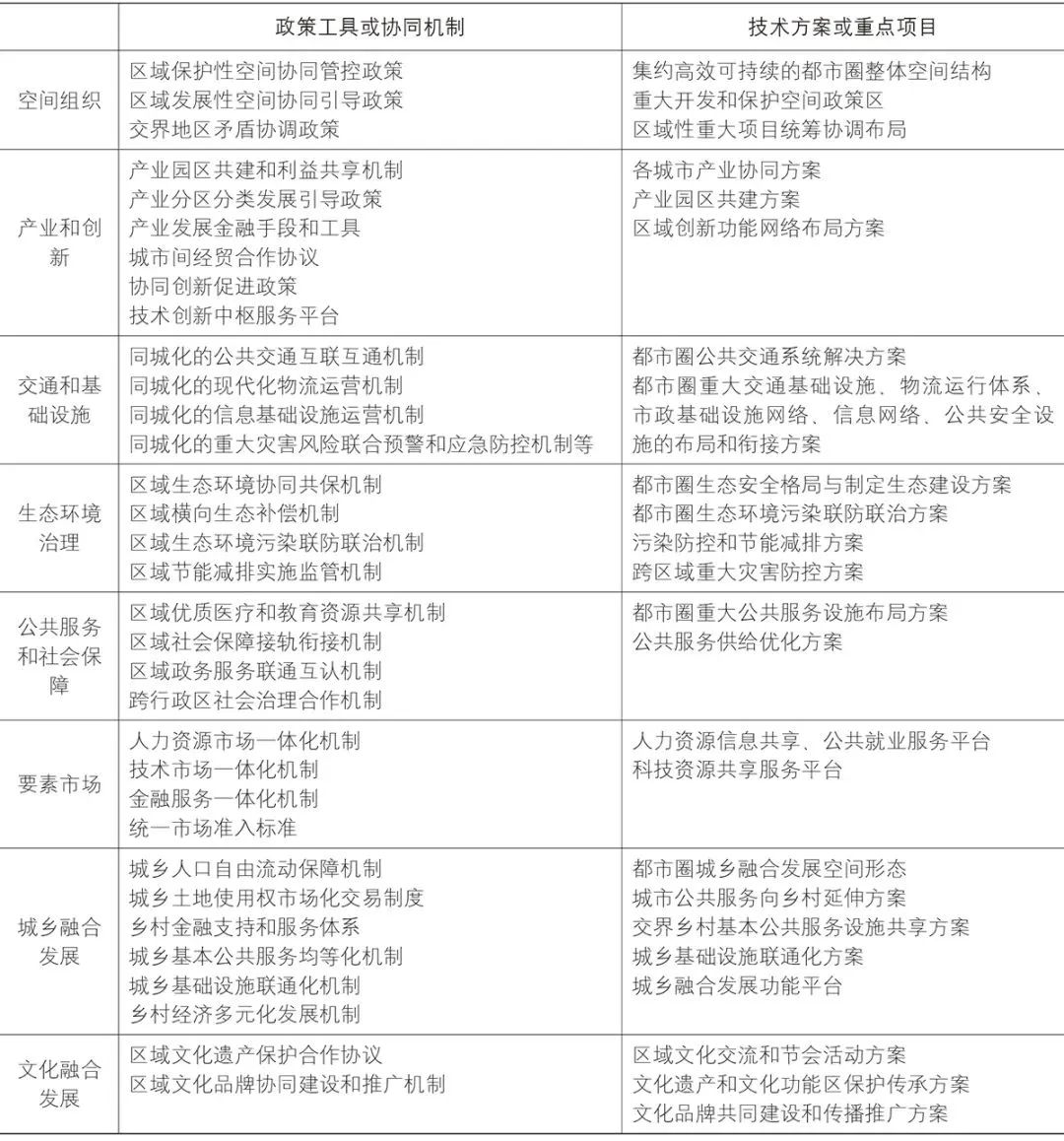 新时期都市圈规划是重要区域政策工具,应将谋划都市圈整体发展、同城化发展和现代治理的政策工具和机制作为核心内容。因此,都市圈规划内容应包括规划政策工具和技术方案两部分,其中政策工具是为实现协同规划目标所谋划的各类政策机制和制度安排,技术方案是各重点领域规划技术协同要点,侧重具体规划方案和行动流程的设计,前者是后者有效实施的制度保障。