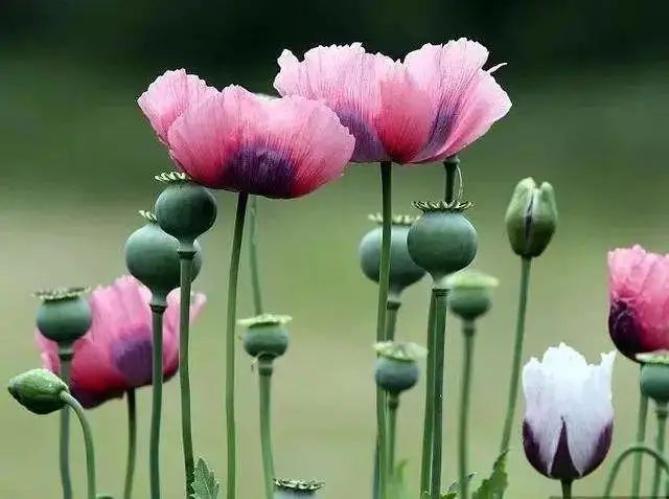罂粟是一年生草本植物。叶片碧绿,花朵五彩缤纷,茎株亭亭玉立,蒴果高高在上,夏季开花,花大,单生枝顶。花瓣4片,红色、紫色或白色。果实球形或椭圆形,种子小而多。