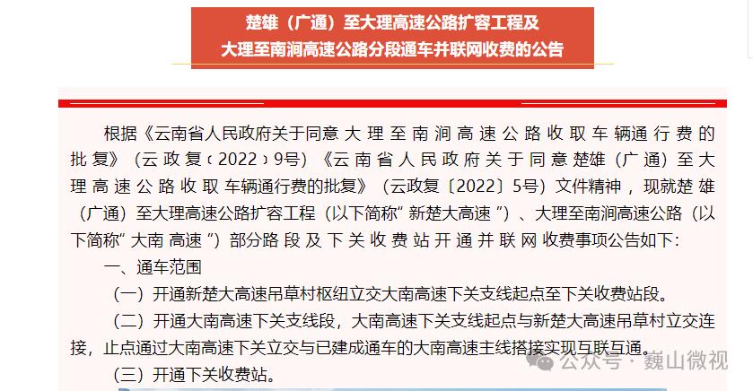 根据日前云南楚大高速公路投资开发有限公司、大理大南高速公路有限公司发布的《楚雄(广通)至大理高速公路扩容工程及大理至南涧高速公路分段通车并联网收费的公告》内容,3月15日中午12:00将开通下关收费站,对过往车辆收取车辆通行费。
