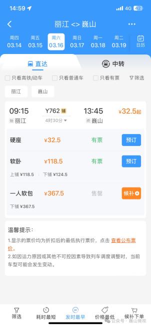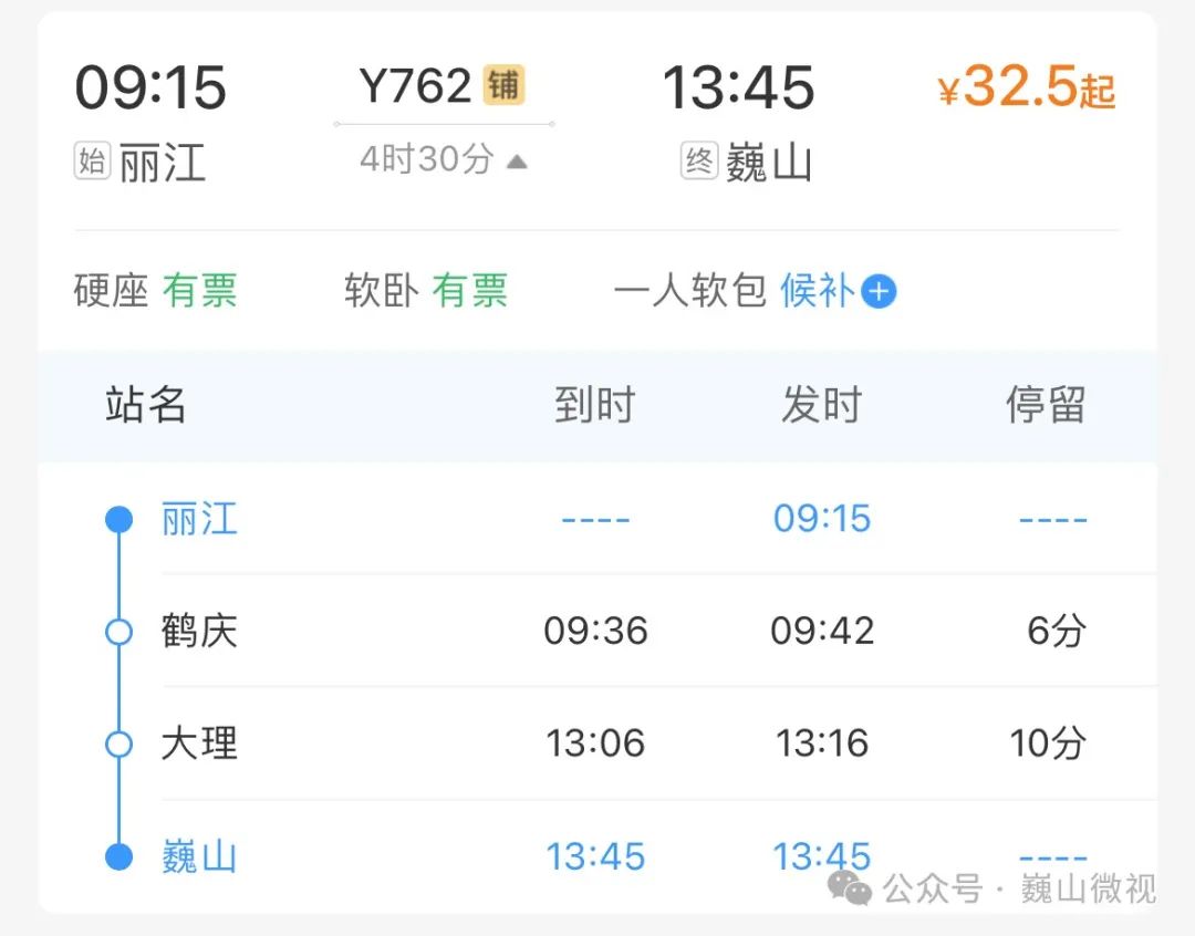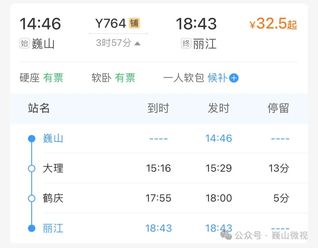 丽江至巍山的硬座票价仅为32.5元