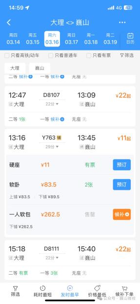 大理至巍山的硬座票价仅为11元