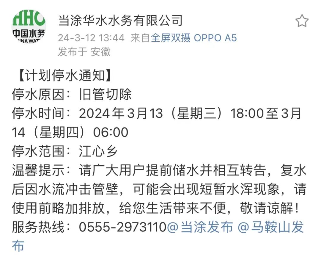 请广大用户提前储水并相互转告,复水后因水流冲击管壁,可能会出现短暂水浑现象,请使用前略加排放,给您生活带来不便,敬请谅解!服务热线:0555-2973110