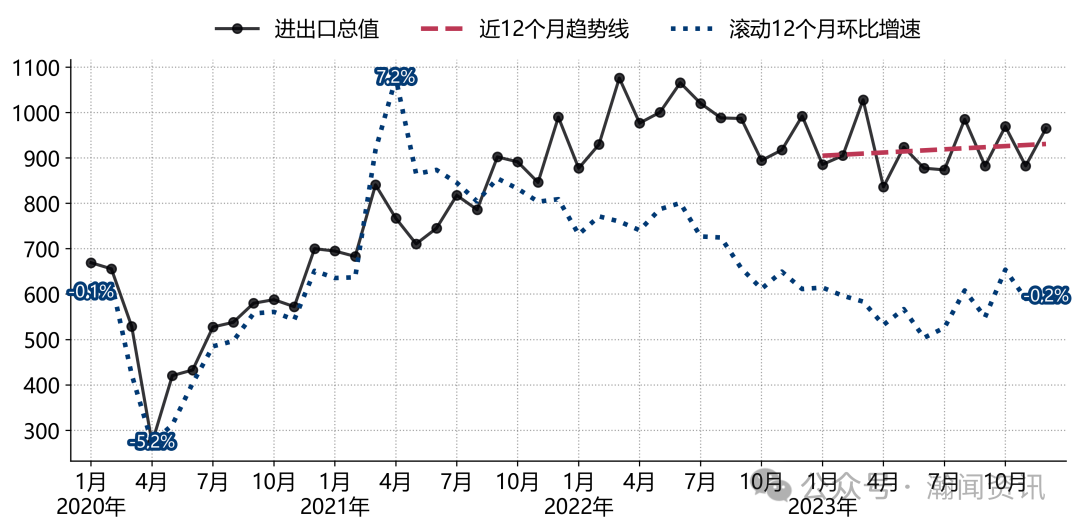 2023年,印度进出口累计11015.1亿美元,同比(较上年)下降6.1%,其中12月当月进出口965.2亿美元,同比下降2.7%,环比(较上月)增长9.4%,近12个月趋势向上。
