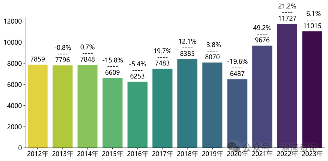 进口与出口分别统计,2023年印度进口金额6702.5亿美元,同比下降6.9%;出口金额4312.6亿美元,同比下降4.7%。