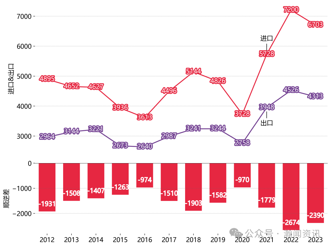 图4 2012-2023年12月印度进口、出口及顺逆差走势图(亿美元)