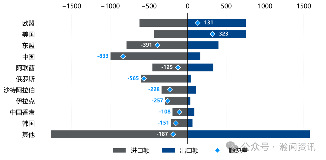 图5 2023年印度主要贸易伙伴及贸易平衡情况(亿美元)