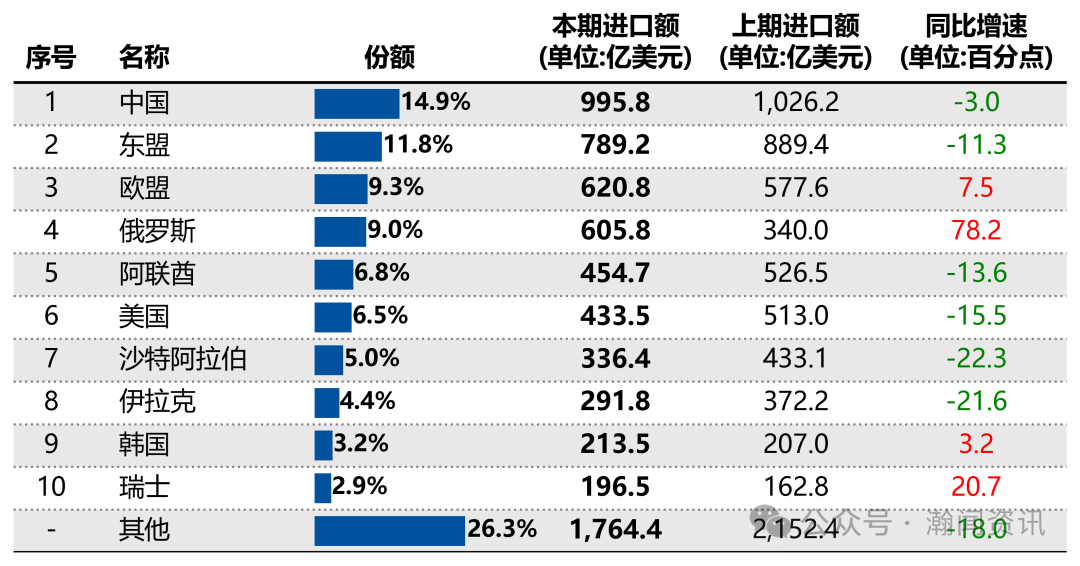按伙伴统计,2023年,印度自全球进口前三位贸易伙伴分别是中国、东盟、欧盟等,其中,印度自中国进口规模第一,金额995.8亿美元,同比下降3.0%;自俄罗斯进口增速最高,金额605.8亿美元,同比增长78.2%;总体来看,在前十位伙伴中,有4个同比增速保持增长。
