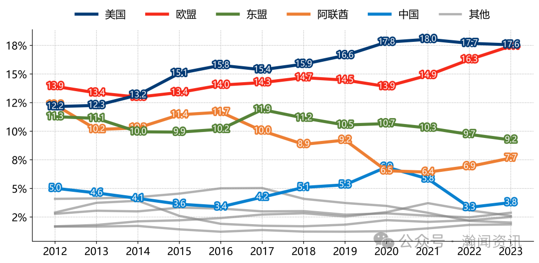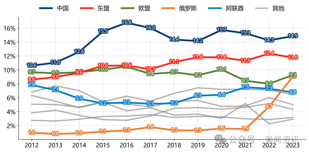图6 2012-2023年12月主要贸易伙伴占印度进口份额变化情况