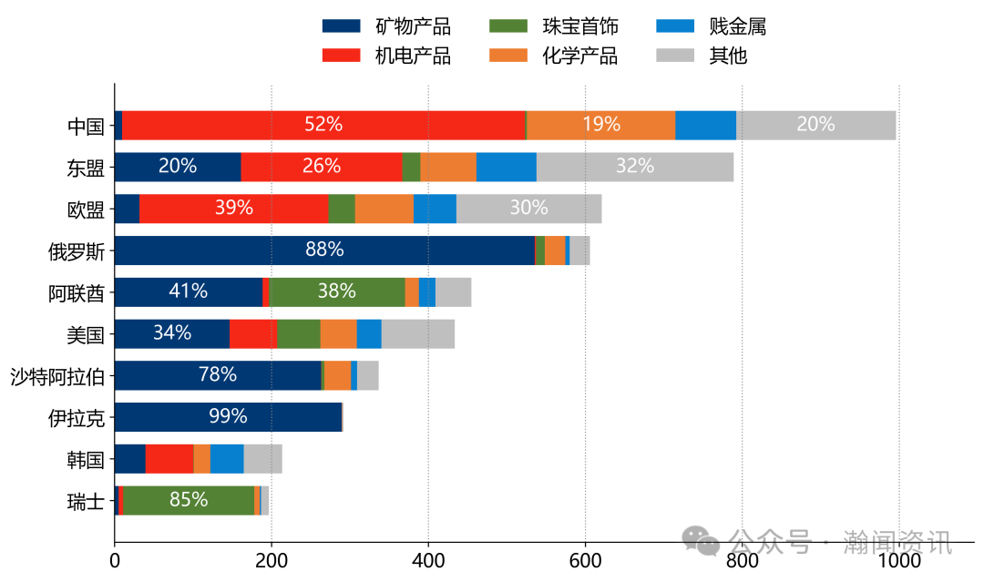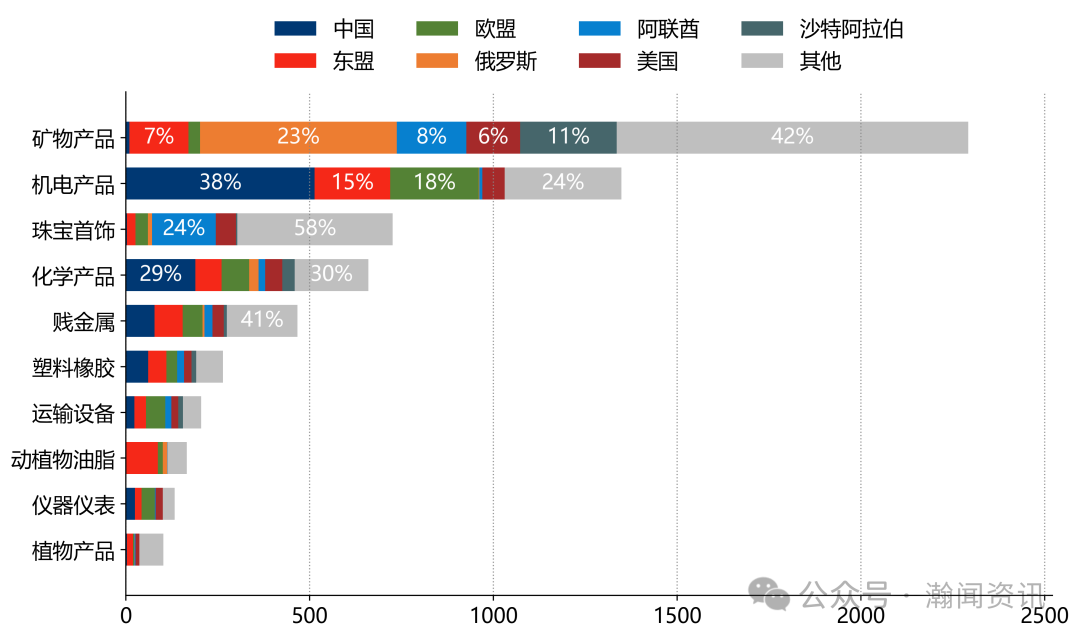 2023年,在印度进口的主要伙伴中,"矿物产品(25-27章)"在俄罗斯、伊拉克、沙特阿拉伯的占比为88.4%、99.2%、78.2%;"机电产品(84-85章)"在中国、欧盟、东盟的占比为51.6%、38.8%、26.1%;"珠宝首饰(71章)"在阿联酋、瑞士的占比为38.1%、85.0%。