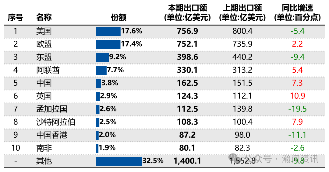 按伙伴统计,2023年,印度对全球出口前三位贸易伙伴分别是美国、欧盟、东盟,其中,印度对美国出口规模第一,金额756.9亿美元,同比下降5.4%;对英国出口增速最高,金额124.3亿美元,同比增长10.9%;总体来看,在前十位伙伴中,有5个同比增速保持增长。