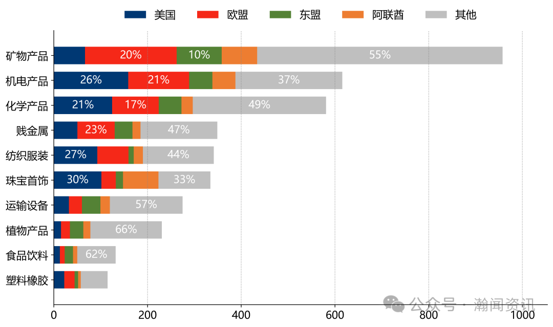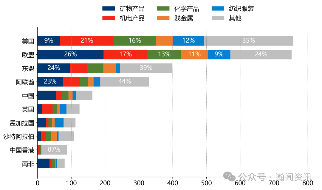 2023年,在印度出口的主要品类中,美国在"机电产品(84-85章)"、"化学产品(28-38章)"、"珠宝首饰(71章)"的占比为25.8%、21.4%、30.4%;欧盟在"矿物产品(25-27章)"、"机电产品(84-85章)"、"化学产品(28-38章)"的占比为20.4%、21.1%、17.1%;东盟在"矿物产品(25-27章)"的占比为10.1%。