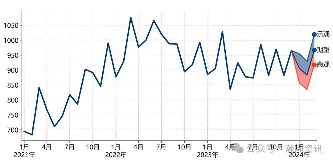 基于印度进出口金额的历史走势分析,在不考虑外部因素情况下,应用Prophet算法,预测未来3个月印度进出口金额分别为906.17亿美元、883.32亿美元、966.75亿美元,同比分别增长2.3%、下降2.4%、下降6.0%。(注:Prophet是由Facebook(META)开发的一种用于时间序列预测的开源库。Prophet模型是一种基于加法模型的时间序列预测方法,它结合了趋势、季节性和节假日效应来建模和预测时间序列数据。需要注意的是,Prophet模型是基于统计的方法,它假设时间序列数据具有一定的规律性和可预测性。)