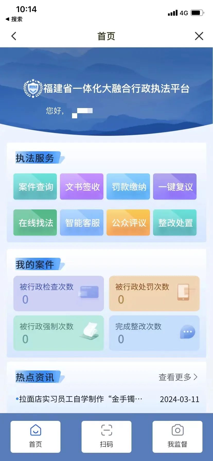 闽执法平台为社会公众提供移动端和电脑端两个入口。在闽政通(公众版)手机APP的闽执法页面,“执法服务”“我的案件”“热点资讯”“扫码”“我监督”五个版块功能一应俱全。