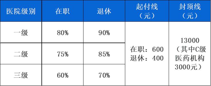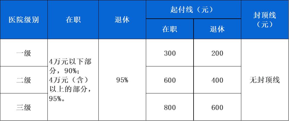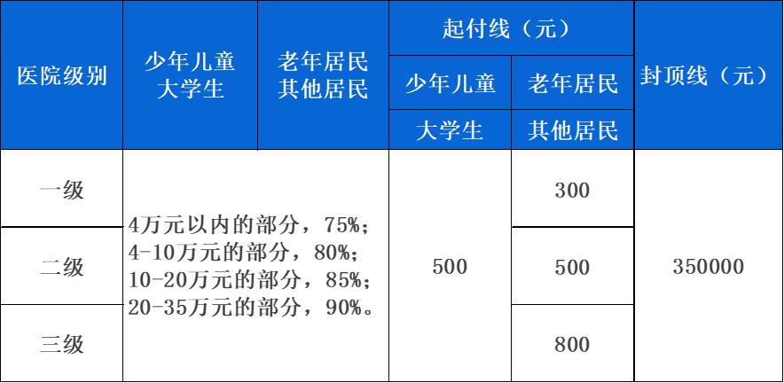 备注:当年度第二次住院的起付线标准为首次起付线标准的50%;第三次及以上住院的统一为100元。