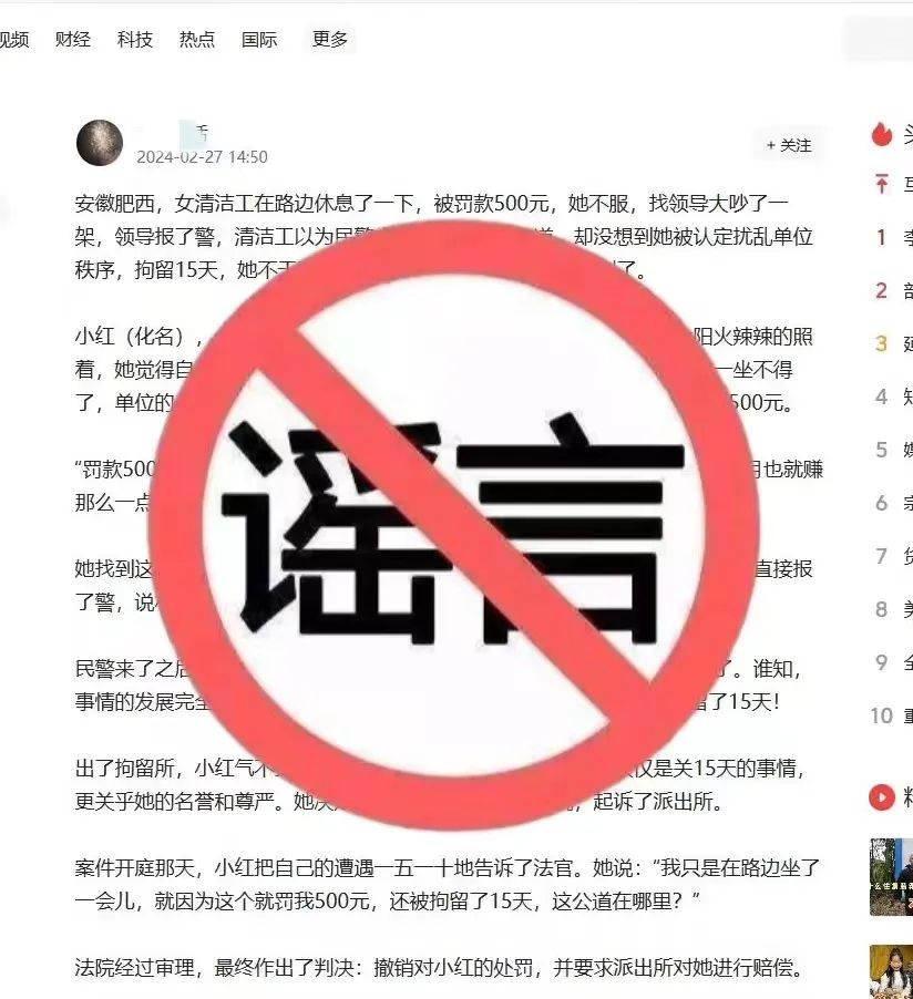 2月27日,网民袁某在某自媒体平台编造、发布“肥西一名环卫工人路边休息被罚款500元,后不服找领导吵架,被认定扰乱单位秩序拘留15天”的虚假信息。经查,袁某为博取关注、吸引流量,编造该虚假信息,引发网民关注,造成不良社会影响。