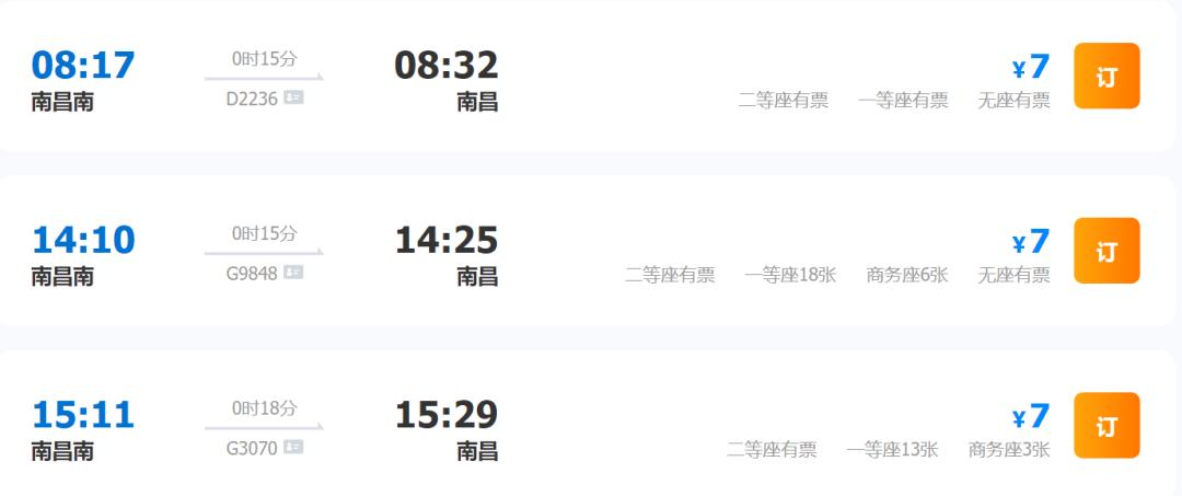 值得一提的是,南昌目前已经开通了“城市换乘”短途高铁。12306网站上显示,南昌南至南昌间开通了一趟单趟仅有15分钟的高铁——南昌南至南昌G9848次列车,主要是方便外地游客来到南昌南站之后,转乘来到南昌站,打卡南昌城区的各大景点。