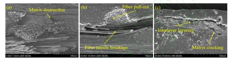 图 10 展示了 HBB-ET 试样失效后 A 截面的SEM 微观形貌。从图 10(a)可知,由于此区域受到强大拉伸应力而产生基体损伤。图10(b)中可以明显看到纤维拉伸断裂,此种失效也是 A 截面中最常见的失效,同时有纤维拔出现象发生,这是因为平纹编织复合材料面外方向的纤维受到剪切从而断裂导致部分拔出。从图 10(c)观察到,在靠近表面处,有明显的分层现象,且伴随着基体裂纹,这是因为表面铺层为(45°/-45°)与内部铺层不一致,在(45°/-45°)与(0°/90°)界面处产生较大应力集中所致。