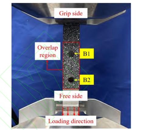 为了对比胶螺混合连接结构在不同环境温度下的拉伸失效过程,探讨温度载荷对胶螺混合连接结构失效行为的影响,利用3D-DIC对HBB-RT和 HBB-ET 试样中 GFRP 复合材料连接件的重叠区域进行了表面应变场及位移场的实时监测,监测区域夹持端和自由端的方位以及加载方向如图13 所示。