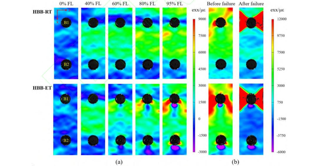 图14(b)比较了HBB-RT试样和HBB-ET试样在失效前和失效后表面应变的变化。HBB-RT 试样在失效前,依旧没有在监测区域发现明显的压缩应变集中,但 B1 螺栓孔两侧出现小部分拉伸应变集中。而 HBB-ET 试样在失效前 B1 螺栓两侧直到试样边缘被扇形高拉伸应力集中区域包围,且两个螺栓下方依然有明显的压缩应变集中区域。失效后 HBB-RT 试样和 HBB-ET 试样都在 B1 螺栓两侧出现扇形的拉伸破坏,表明拉伸破坏导致了结构的失效,但 HBB-RT 试样的拉伸坏区域小于 HBB-ET 试样。