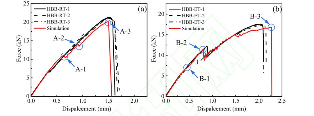 图15 不同工况下试验与仿真载荷-位移曲线对比图:(a)HBB-RT:(b)HBB-ET