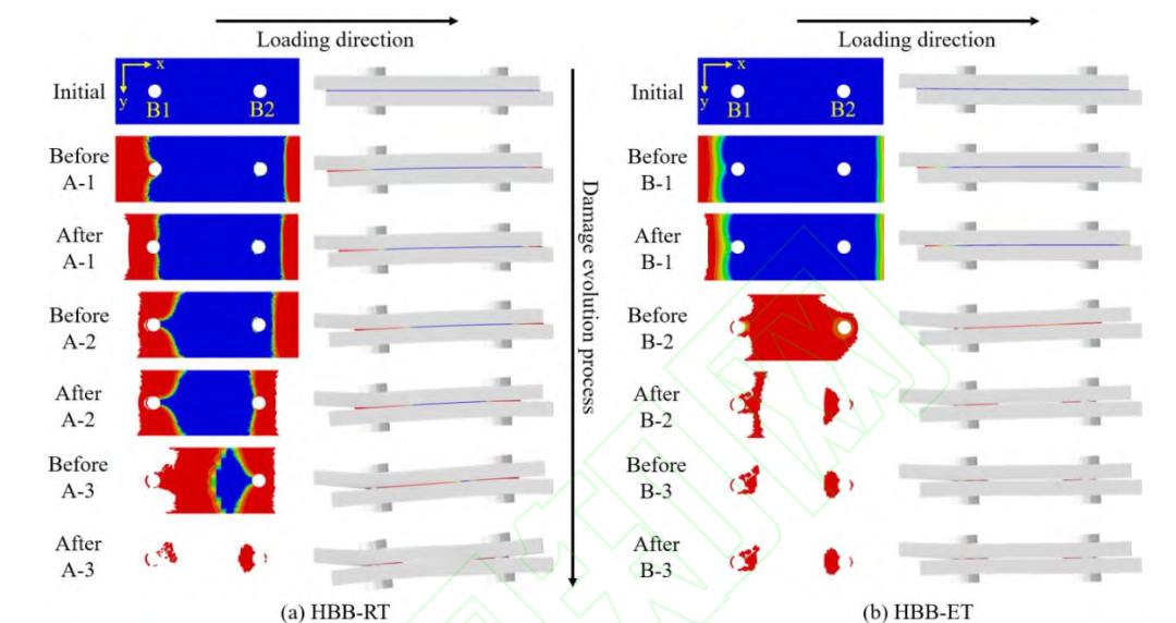 对于胶螺混合连接试样,胶粘剂的失效的过程随着环境温度的改变而产生差异,HBB-RT 数值模型和 HBB-ET 数值模型中胶粘剂的失效过程如图17所示。图中A-1、A-2、A-3、B-1、B-2和B-3分别对应图15(a)和图15(b)中所标注的掉载点或斜率下降点。