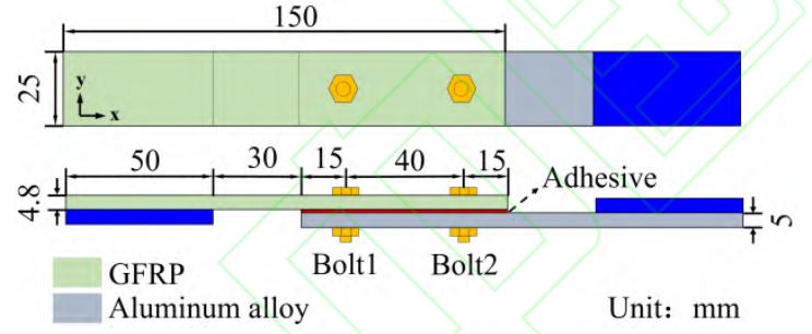 其中复合材料层合板使用的是中航复合材料有限公司生产的 ACTECH ® 1203/EW301F/38 中温固化环氧玻璃布预浸料,通过手工铺贴热压罐(RG21,西安龙德科技有限公司)成型工艺制备。层合板铺层方案为[(45/-45) 2 (0/90) 8 ] S ,共 20 层,总厚度 4.8mm,本文使用的为平纹编织复合材料预浸料,铺层方案中(45/-45)和(0/90)分别表示预浸料平纹编织的单层,其中顺纤维方向为(0/90)铺层,旋转 45°后得到(45/-45)铺层。金属连接板为 2024-T4 铝合金,板厚度 5mm。紧固件采用ML30Cr-MaSiA 结构钢自锁螺栓(HB1-103, 航天精工股份有限公司)和螺母(GB1337, 航天精工股份有限公司),直径 D=5mm。胶粘剂采用环氧结构胶(DP490, 3M)。